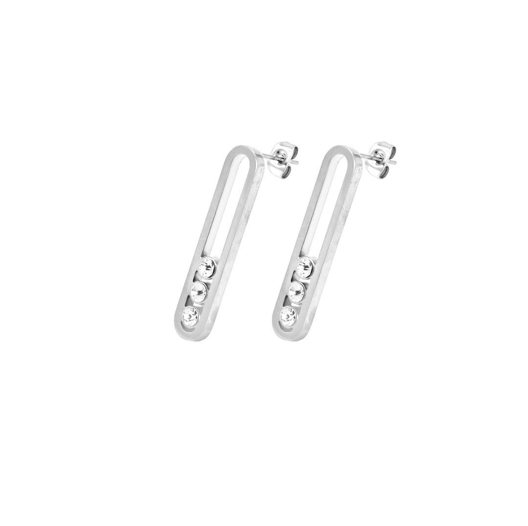 Ατσάλινα σκουλαρίκια καρφωτά κρεμαστά σε ασημί χρώμα και οβάλ σχέδιο με 3 σταθερά λευκά στρας (ύψους 3cm Χ μήκους 0,6cm). Ένα υπέροχο ζευγάρι που θα σας ενθουσιάσει.
