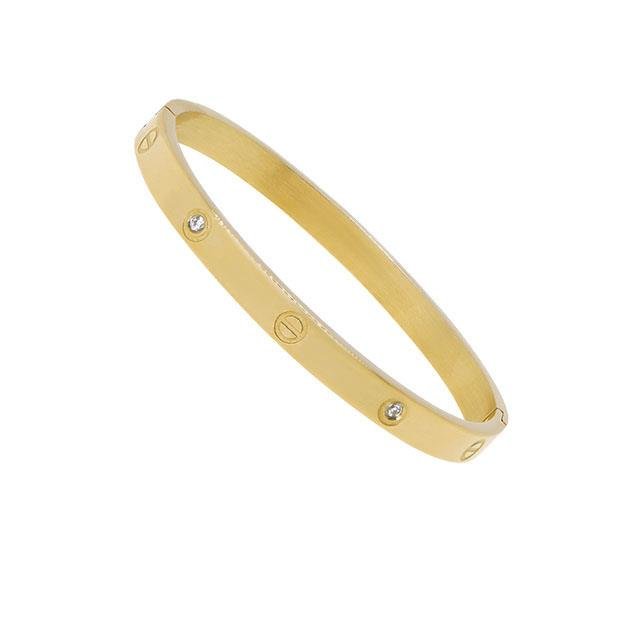Ατσάλινη χειροπέδα σε χρυσό χρώμα. Μια χειροπέδα σε μοντέρνο σχέδιο που φέρει λευκές διακριτικές πέτρες. Ένα υπέροχο κόσμημα για όλες τις ώρες της ημέρας